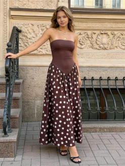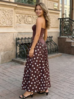 Women Long Tube Top Dress Dot Print Sleeveless Waist Cinching A-line Dress for Party Club Bohemian 2026 Summer