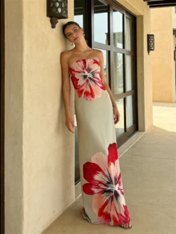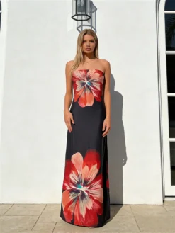 Women Long Dress Floral Print Strapless Tube Dress for Party Evening Elegant Summer Fashion Casual Dresses