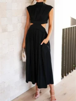 Women Summer Long Dress Solid Color Sleeveless Mock Neck Hollow Out A-line Dress Sexy Elegant Beach Holiday Loose Dresses