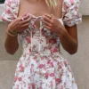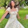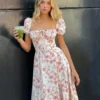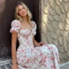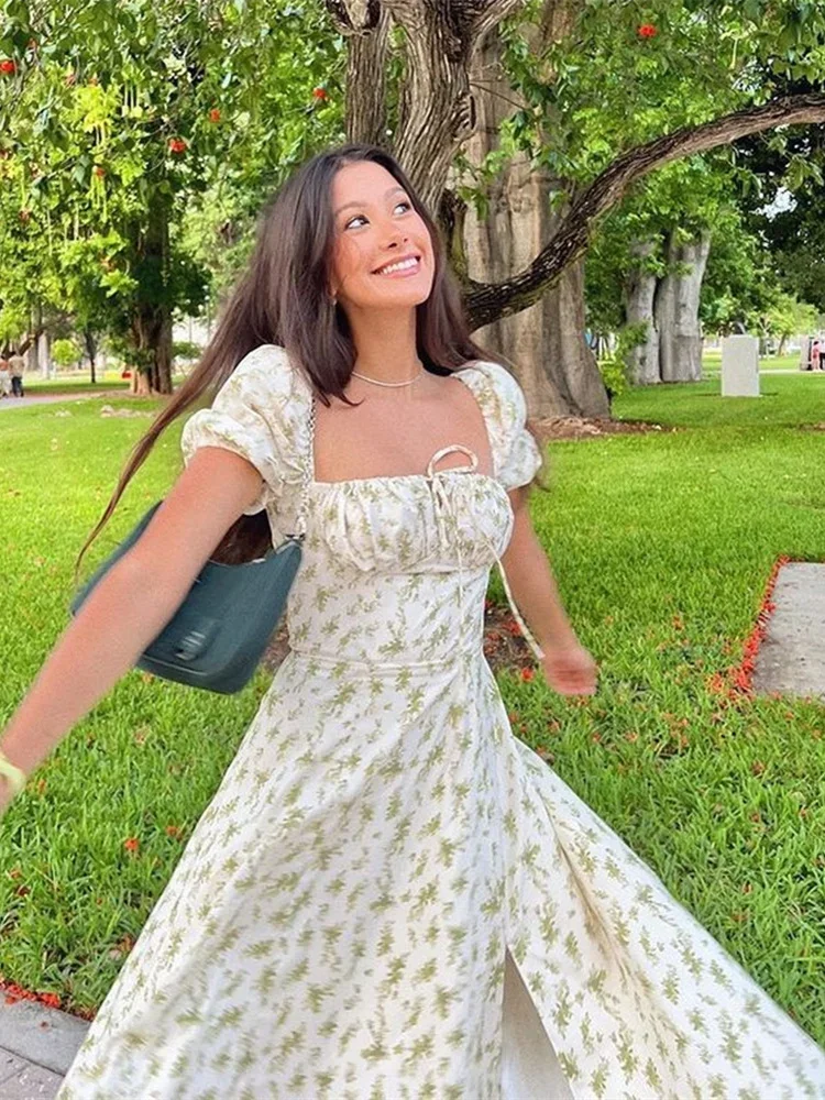 Puff Sleeve Floral Long Dress Women Summer Short Sleeve Square Neck Lace-up Split Dress Casual Sexy Vintage Dresses Female 2026