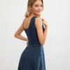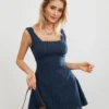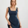 Womens Summer Tank Dress Sleeveless Square Neck Lace Trim Solid Color A-line Dress Short Mini Dress